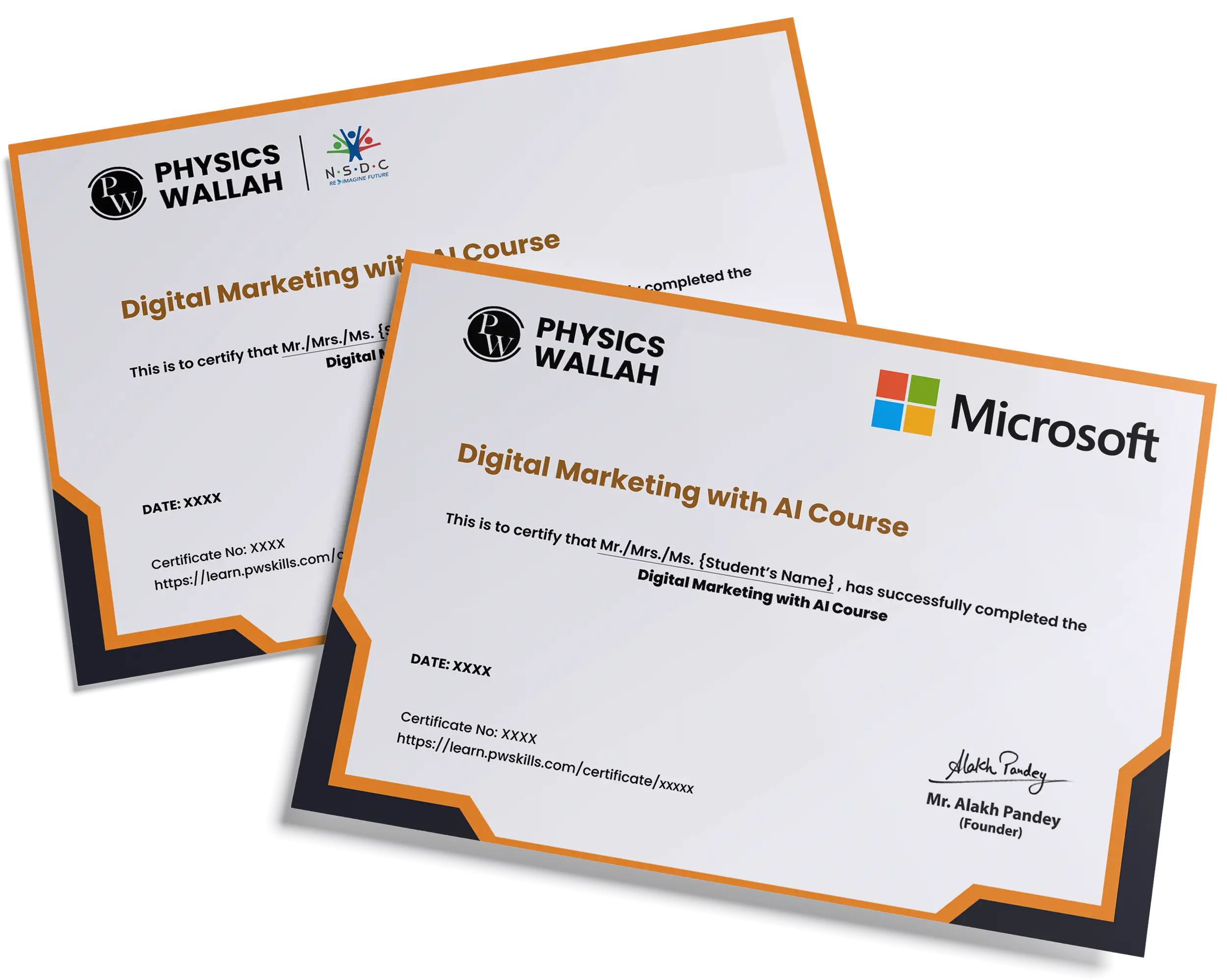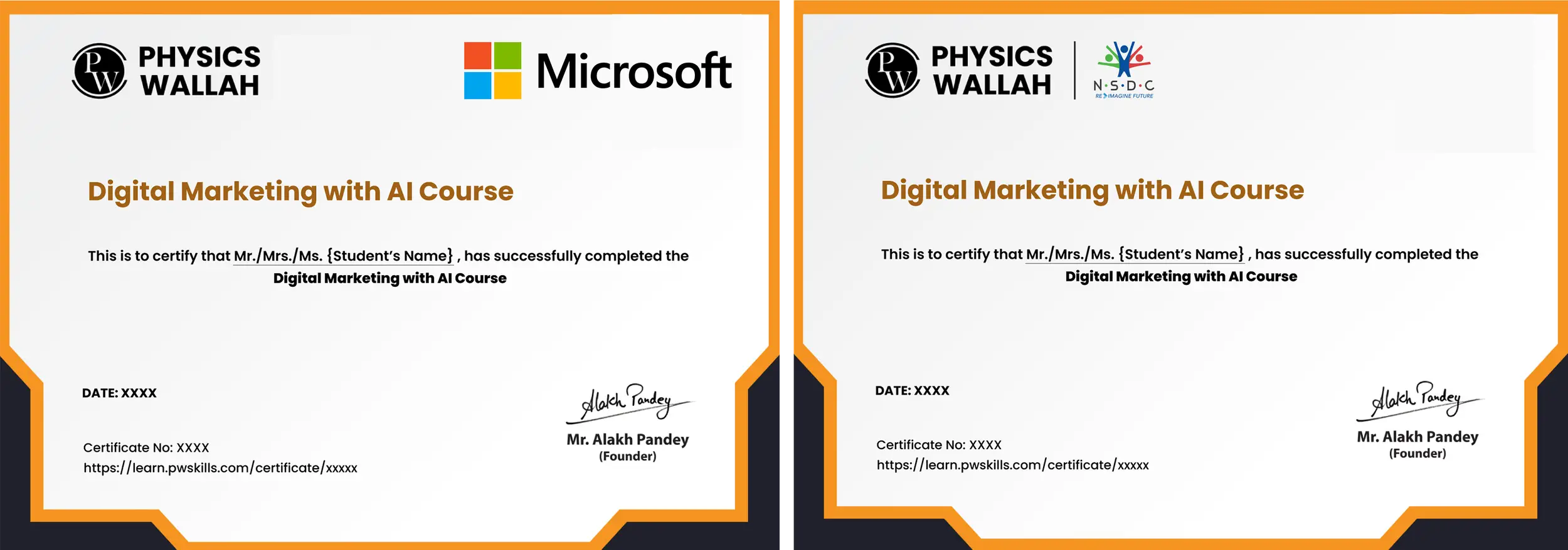 Certification | PW Skills Certificate | Co-branded Certificate — 2 certificates:PW Skills x NSDC and PW Skills x Microsoft | Co-branded Certificate — 2 certificates:PW Skills x NSDC and PW Skills x Microsoft |